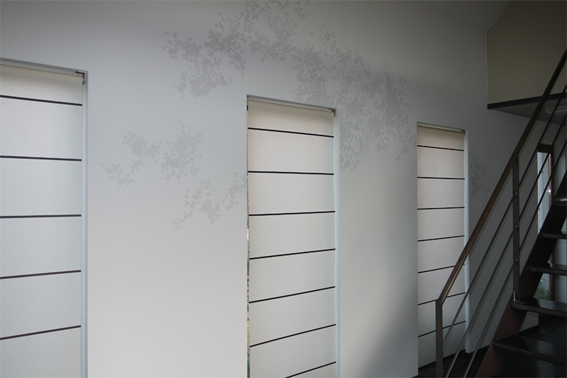 Tussen de drie ramen naast de trap laat ze een subtiel spel van